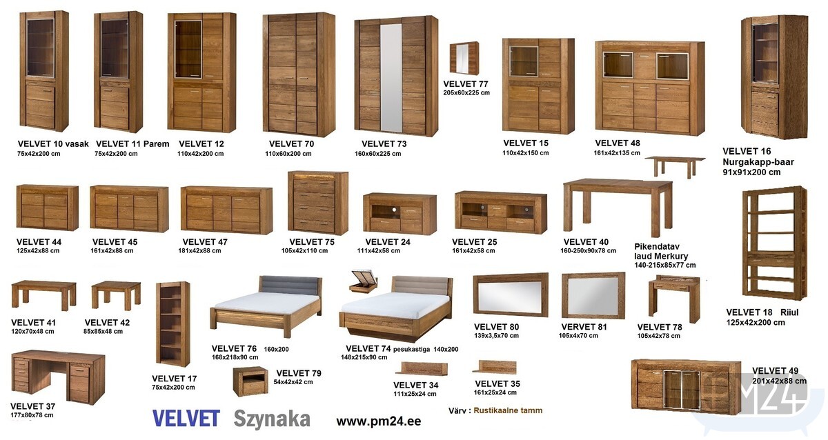 Серия VELVET изготовлена из натурального дерева. Фасад из натурального дерева дуб. Корпус из натурального шпона. Отделка: вощёная поверхность. Ящики и двери с механизмомо плавного закрывания. Ручки металические.